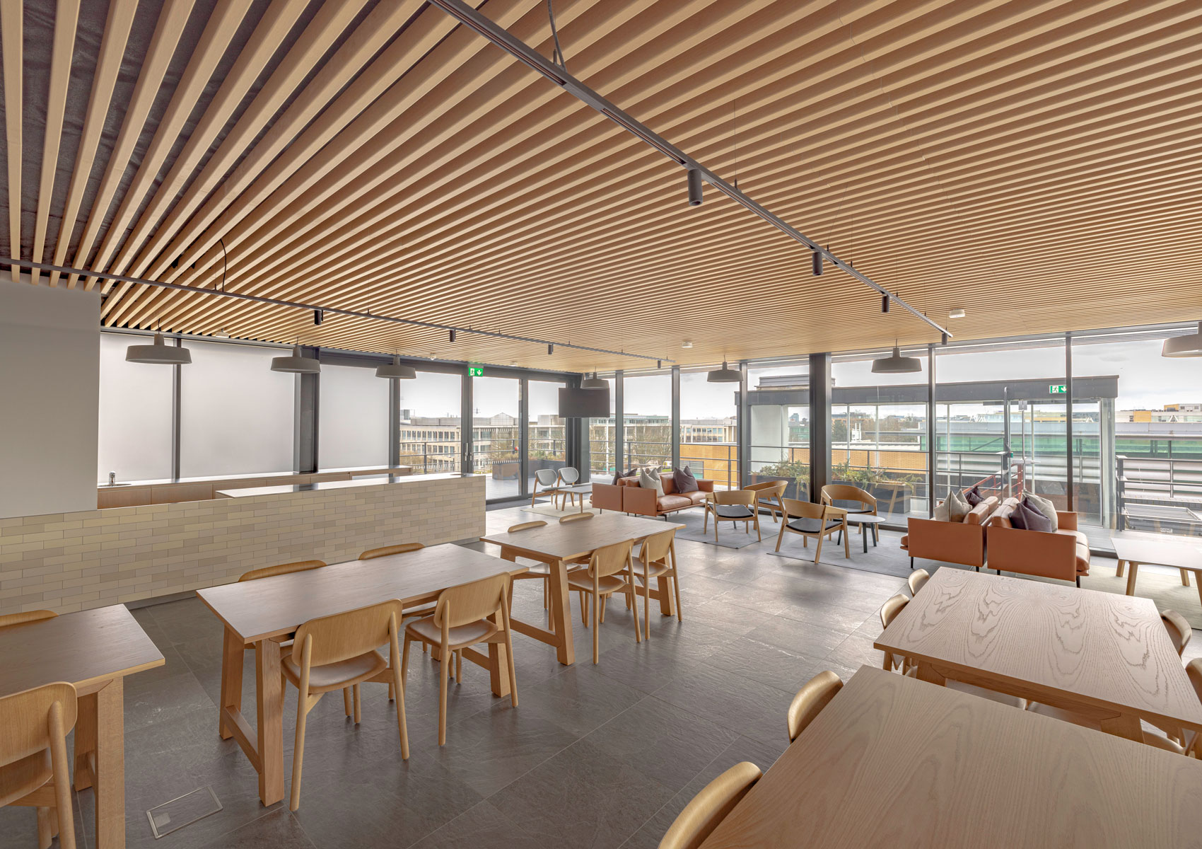 LSA and Gustafs were specified to supply the timber acoustic ceilings on the scheme, with the flat panel system throughout the main atrium and stairwells and linear rib system in the café and breakout area.