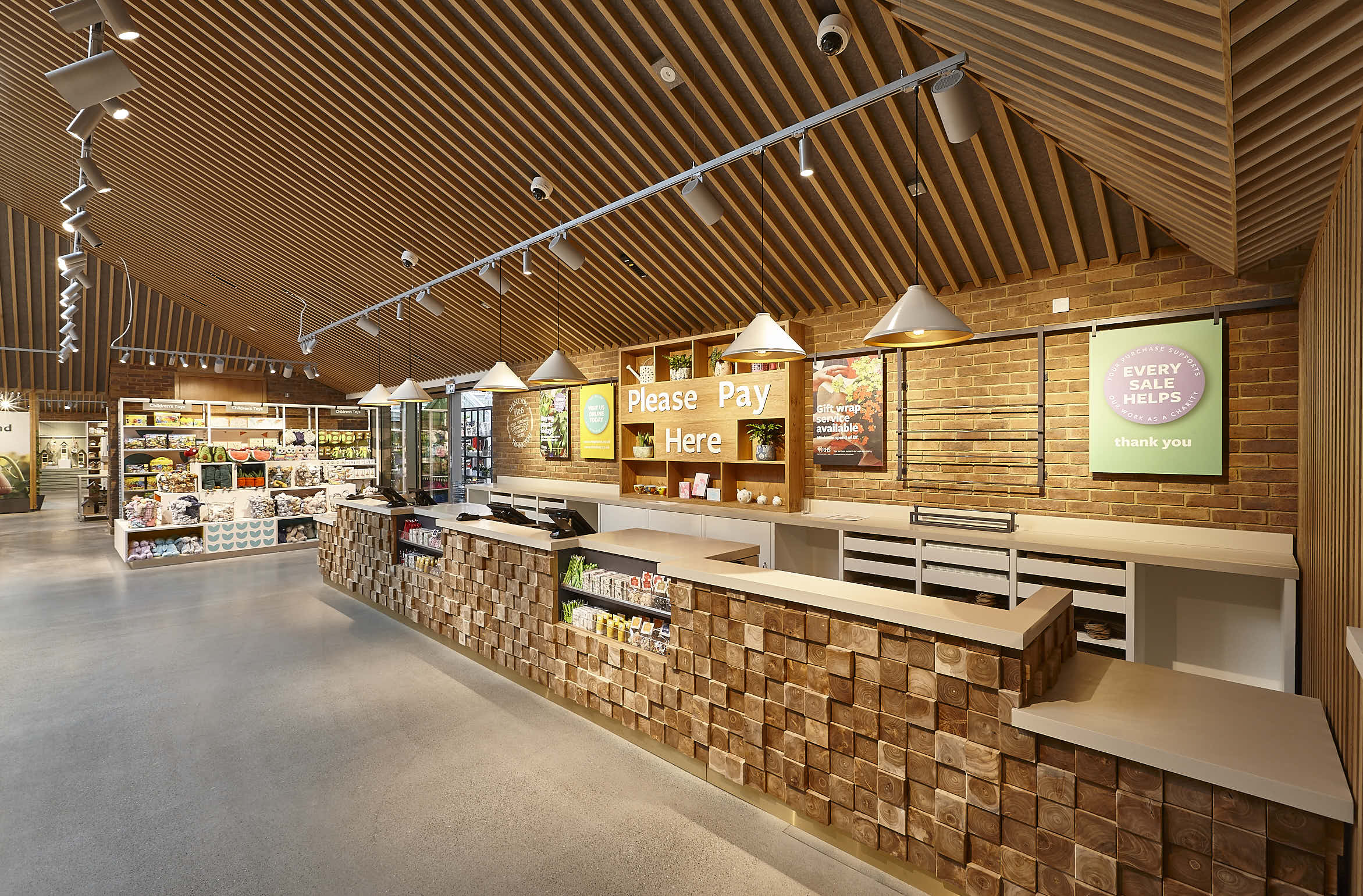 27 Polylam baffles with L6 perforations and filled with acoustic mineral wool were installed below the Rhombus panels above the shop’s till desk and signature black and gold ‘B’ wall.