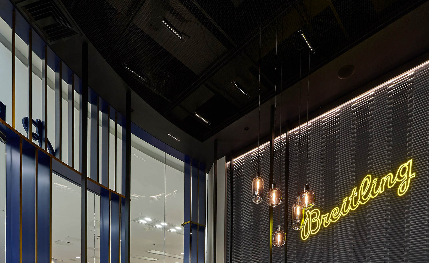 A mixture of Durlum Rhombus expanded metal ceiling panels and Durlum Polylam acoustic metal baffles were supplied to Breitling UK Ltd for their Westfield White City store.