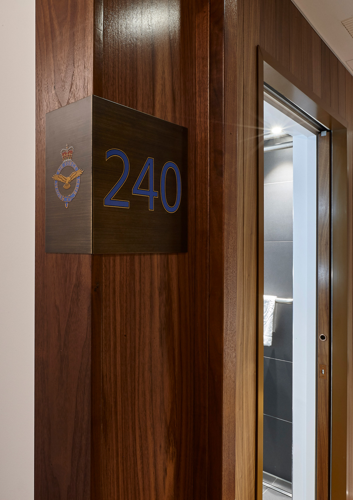 The plank system at the RAF Club is made up of 100mm wide natural Walnut veneer wrapped planks installed to the feature wall sections in 12 hotel rooms as well as in the lift lobbies over 4 floors at the club in Piccadilly.