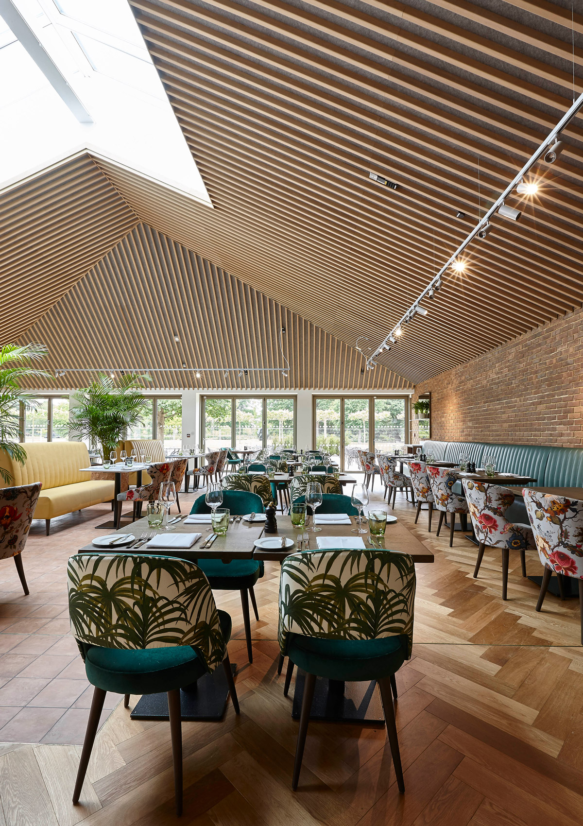 In keeping with the natural and ‘green’ ethos of the RHS the scheme architect’s at KSS specified linear ribs for the pitched ceilings across the space, the system is comprised of a solid gypsum core rib wrapped in a choice of natural or faux timber veneer and delivered with a unique and versatile ‘easy-up’ installation system.