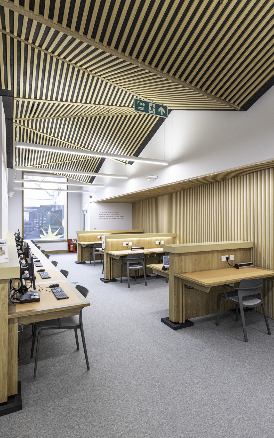 We are delighted to have supplied Gustafs Linear Ribs for the acoustic feature ceiling in the library and the skilled installation by the team from our recommended installers at Topfix Interiors Ltd brought the architects’ design to life with beautiful joinery details to compliment the rib system.